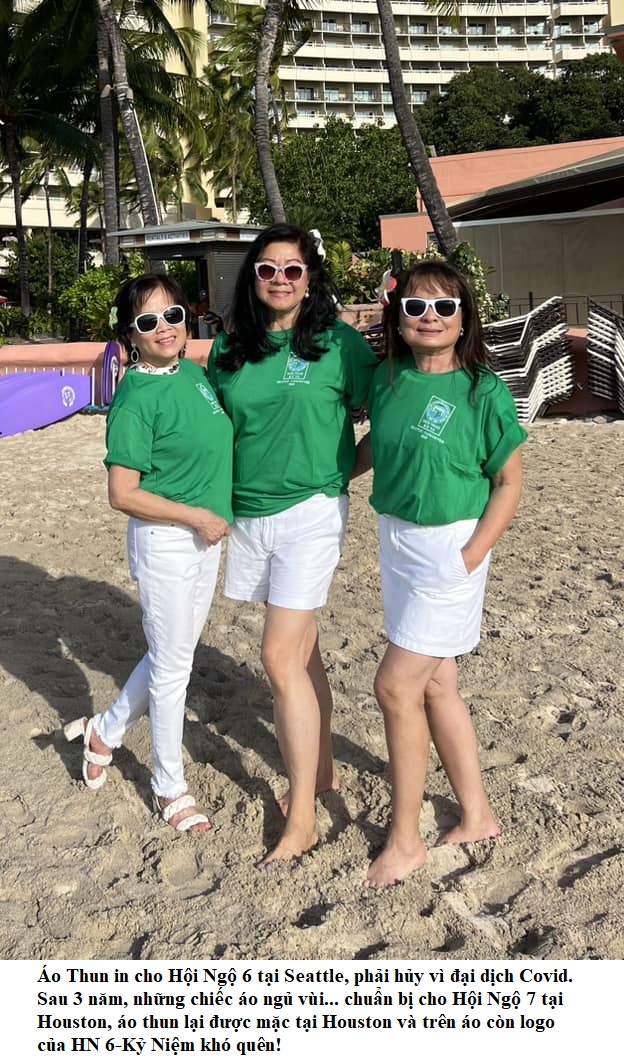 Êm rồi, tôi nhờ Nga tìm cách đem qua một ít, số còn lại…cùng lắm mình gởi dịch vụ từ ĐN qua Houston luôn. Phút cuối có tin mừng, bạn Minh Mậu khoá chúng tôi đang ở ĐN, bạn vui lòng đem qua Houston… miển phí. Niềm vui vở oà. Cưng quá mấy bạn cùng khóa! Và rồi... những chiếc áo T shirt màu xanh lá cây đầu tiên được các người mẫu trình diễn... không phải ở Cao nguyên Tình xanh mà tận ngoài Hawaii một hòn đảo xinh đẹp thơ mộng, khi nhóm bốn đứa: Kim Chi, Khánh Minh, Hồng Loan và Anh Trinh đi Hawaii đóng phim vào tháng 2 năm 2023. Những áo T shirt xanh lá cây cho Hội ngộ kỳ 6 long đong lận đận sau 4 năm mới được đem ra làm đồng phục cho Hội Ngộ 7 trên du thuyền. |