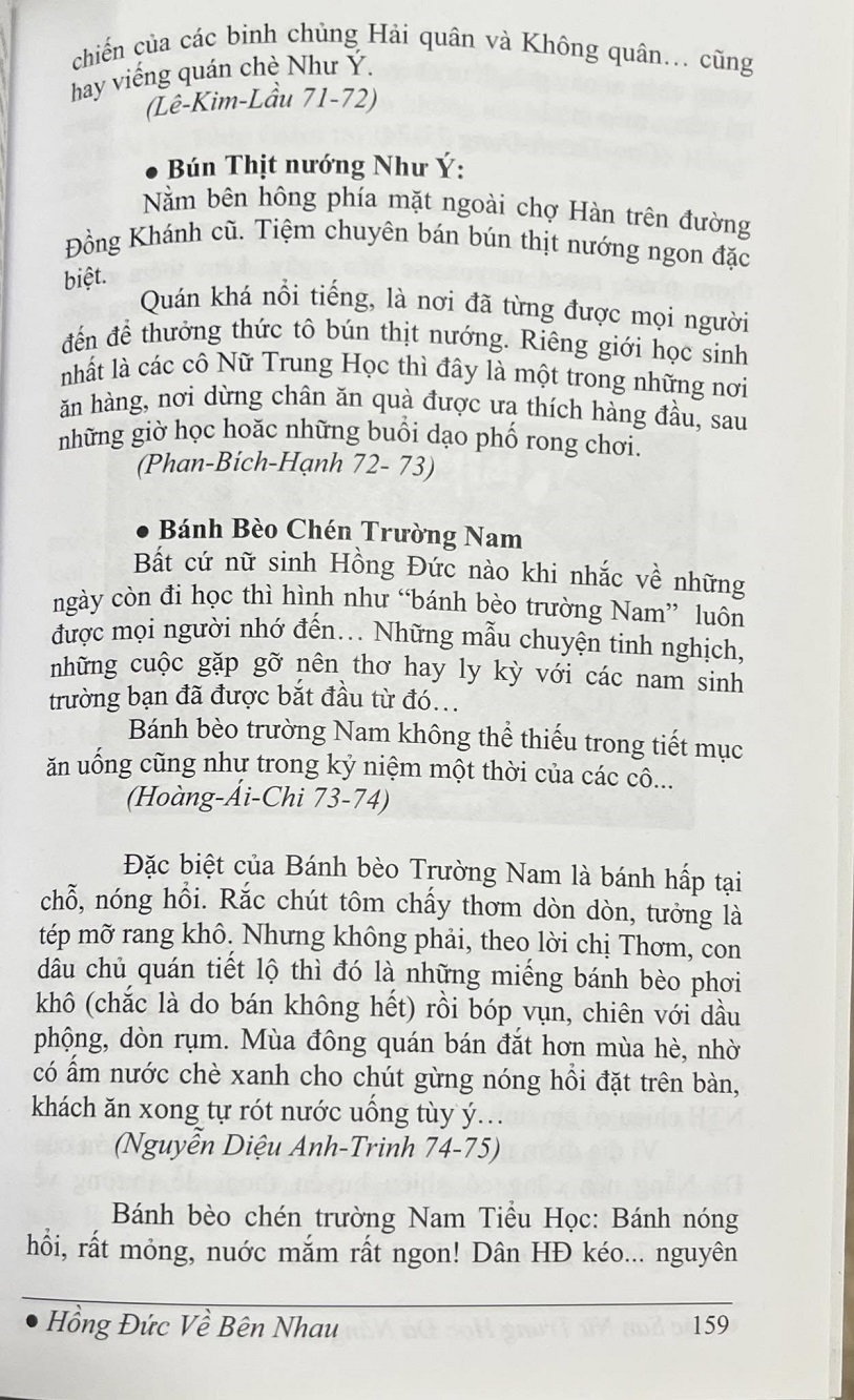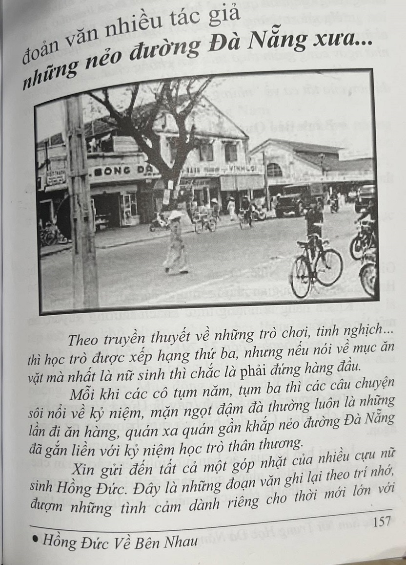 là món quà tinh thần lớn lao cho nhóm điều hành. Bên cạnh những bài đã gửi về, hoặc sẽ đóng góp của những cây viết Hồng Đức thường xuyên tham gia. Phần lớn các chị ngại ngùng, không biết bắt đầu từ đâu, khi cầm viết lên thì ý tưởng bay đi... dù là tình cảm về trường xưa, thầy bạn đầy ắp trong ký ức. Chúng tôi xin trích đăng một hợp bút gồm nhiều cựu nữ sinh trong Đặc San số 3 "VỀ BÊN NHAU" Phát hành năm 2014 tại Virginia trong ngày Đại hội lần thứ 3 Một phần đặc sắc gồm nhiều đoản văn khá thú vị, linh động về đề tài "Những nẽo đường Đà Nẵng Xưa...", đã nhắc lại về những quán hàng thân quen một thời! |