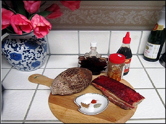 - 1 miếng thịt heo quay chừng 1 đến 1 1/2lbs. - 1 củ khoai môn cân lương bằng heo quay - 1 viên chao - 2 muỗng canh rượu Mai Quế Lộ - 1/2 muỗng cà phê ngũ vị hương - 2 muỗng canh dầu hào - Xì dầu, đường, muối, tiêu