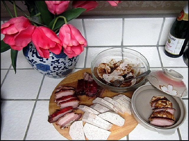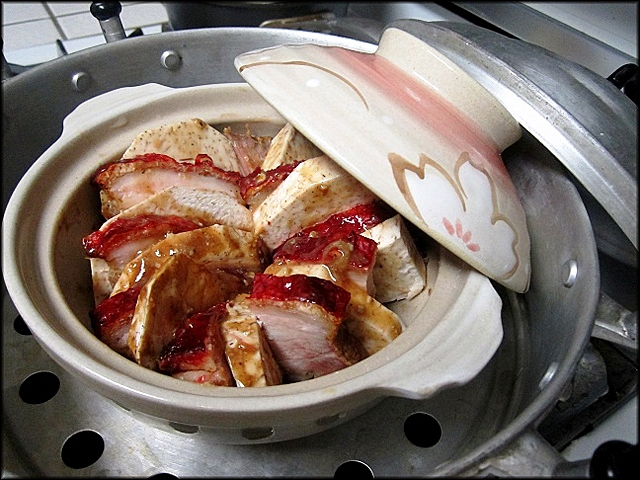 Sau đó dùng một cái nồi đất hay thố có nắp, sắp khoai môn và thịt quay xen kẻ (giống trong hình). Sau cùng nước ngâm khoai còn thì chan đều lên trên khoai và thịt quay.