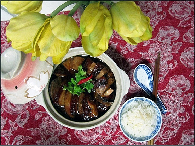 khéo. Món Khoai môn hầm thịt quay cũng không ngoaị lệ. Sau khi đút lò thì cái béo của thịt quay mềm và quyện với khoai môn cũng đã mềm, thật là một tác hợp tuyệt! |