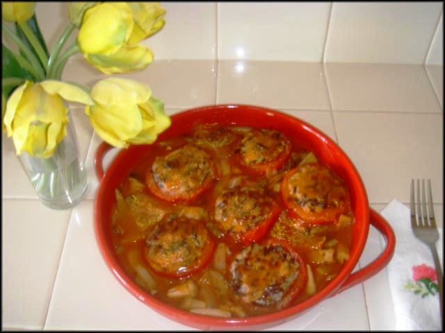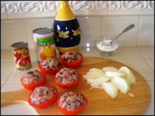 Cách làm: Cà chua rửa sạch, cắt ngang làm đôi, dùng muỗng múc trong ruột cho sạch và hết hột, dùng giấy chùi tay lau cà cho ráo nước và để qua một bên. Hành củ xắt miếng lớn như để xào. Thịt heo cho vào tô, cho nấm mèo và gia vị vào trộn đều ( có thể cho thêm hành bằm nhuyễn họac đậu petit pois nếu thích). Dùng một muỗng múc thịt đã ướp cho vào cà đã chuẩn bị trên đây. Cho thịt vừa đầy miếng cà thôi để mau chín. Bắc chảo lên bếp lửa vừa cho dầu olive vào, để miếng cà đã nhồi thịt vào, mặt có thịt heo xuống chiên trước, chừng 5 phút thì trở mặt dưới lên chiên chừng 2 phút. |