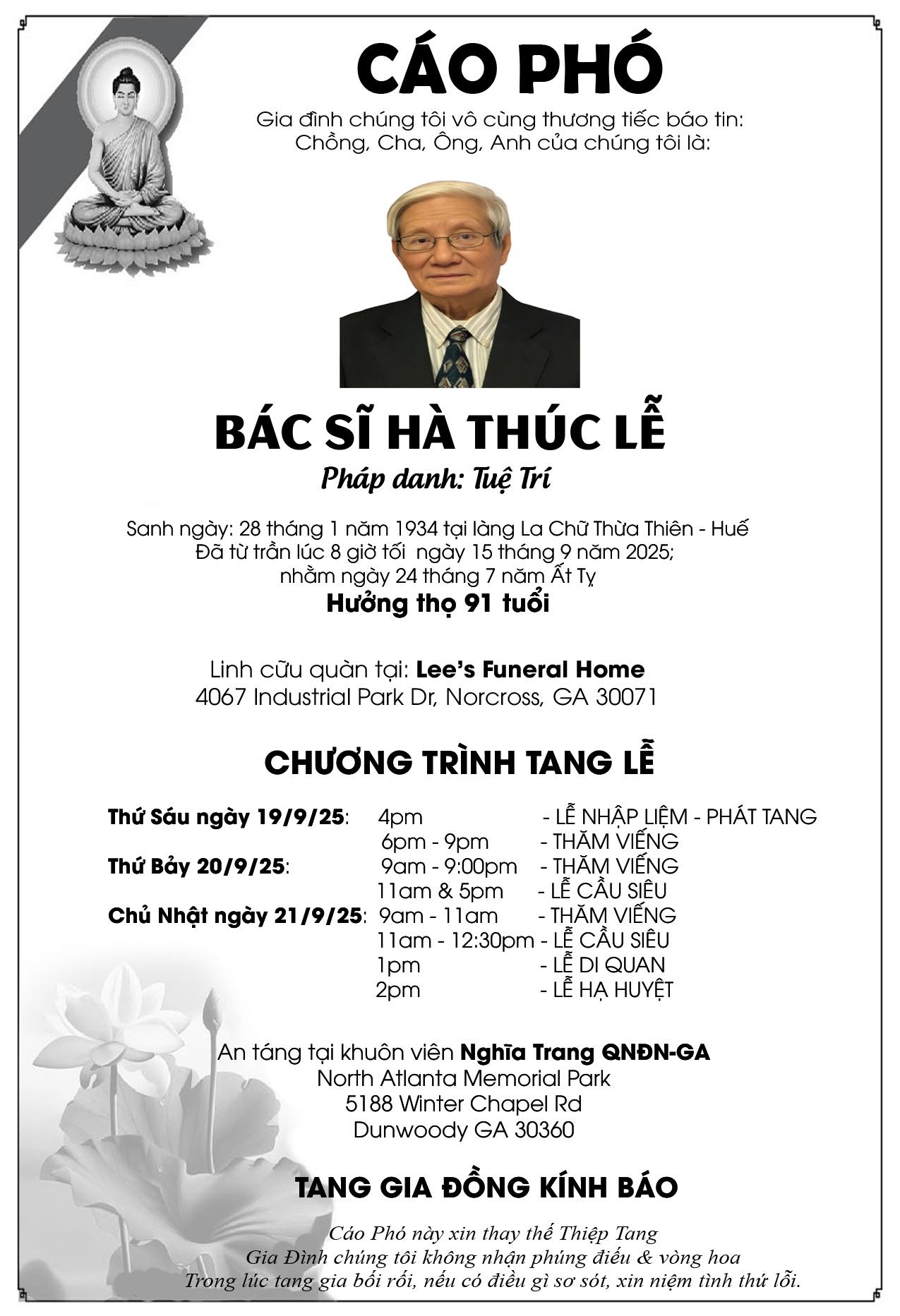 Nhận được hung tin: Phu Quân của Chị LÊ PHƯƠNG THẢO cưụ Nữ Sinh NTH Hồng Đức NK 74-75 Bác sĩ HÀ THÚC LỄ Pháp Danh TUỆ TRÍ Đã từ trần lúc 8 giờ tối ngày 15 tháng 9 năm 2025 Tại Atlanta, GA Hoa Kỳ Hưởng Thọ 91 tuổi. |