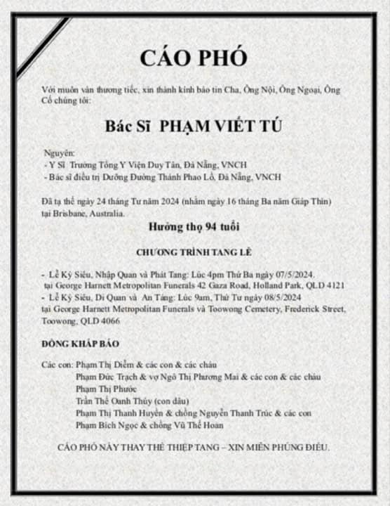 Nhận được tin: Thân phụ Chị PHẠM THỊ PHƯỚC NK 73-74 Cụ Ông PHẠM VIẾT TÚ Nguyên Y Sĩ Trưởng Tổng Y Viện Duy Tân, Đà Nẵng Bác Sĩ Điều Trị Dưỡng Đường Thánh Phao Lồ, Đà Nẵng Đã vĩnh viễn ra đi ngày 24 tháng 4 năm 2024 tại Brisbane, Úc Hưởng thọ 94 tuổi |