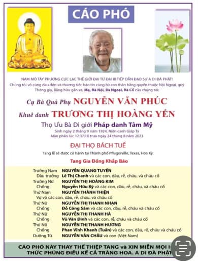 PHÂN ƯU Thân Mẫu Chị NGUYỄN THỊ THANH NHẠN Cụ Bà Quả Phụ NGUYỄN VĂN PHÚC Khuê Danh TRƯƠNG THỊ HOÀNG YẾN |