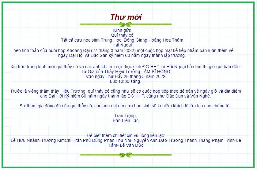 việc tổ chức Đại Hội 60 năm thành lập ĐG tại Hải Ngoại năm 2023 . Nhất là các em Nhi, Đào, vợ chồng em Lợi đã lái xe 7 tiếng đường xa để họp mặt. Cầu nguyện cho thầy hiệu trưởng sức khỏe dồi dào, cùng các em học sinh ĐG được nhiều sức khỏe vui vẻ hạnh phúc trẻ khỏe nhiều để có thể nhiều lần gặp nhau nữa. |