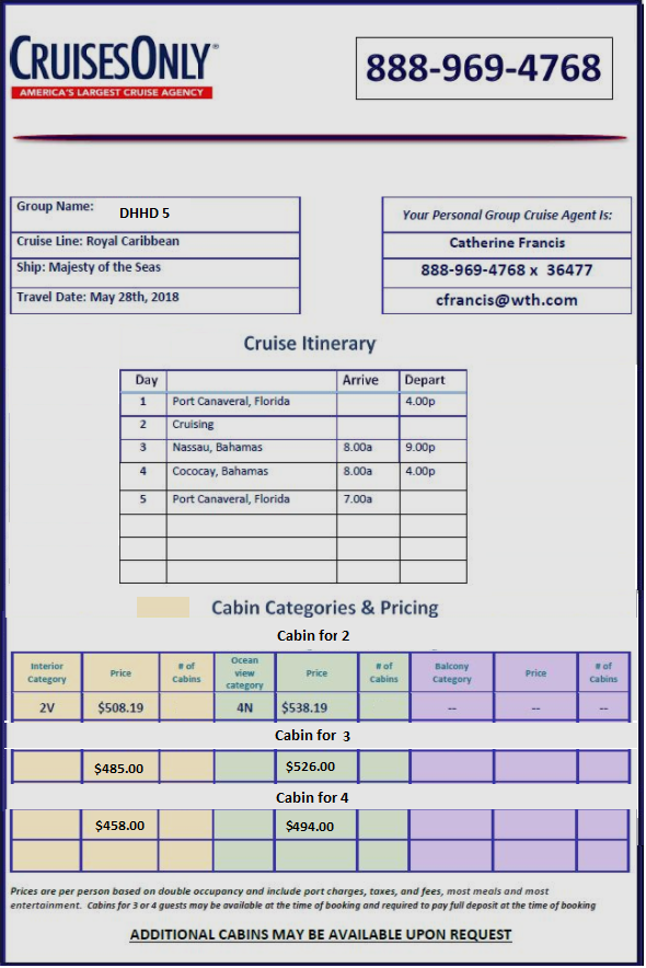 biết của Royal Caribean Cruise, Tàu Majesty of The Seas. Xin vui lòng liên lạc trực tiếp với agent: Catherine Francis Điện thoại: 1-888-969-4768 ext 36477 |