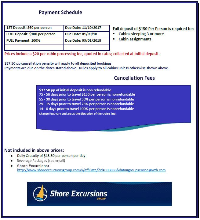 Sau khi gọi đặt vé cruise, lịch trình để đóng tiền cho cruise sẽ như sau. Lệ phí sẽ được chia ra 3 lần: - Lần đầu để giữ chỗ vào November 10th, 2017 - Lần thứ nhì vào January 9th , 2018 - Lần sau cùng vào March 1st, 2018 Liên lạc với agent đã được chỉ định cho group DHHD 5: Catherine Francis Điện thoại: 1-888-969-4768 ext 36477 Khi gọi để đặt chổ hoặc deposit tiền dùng code của group để được giá dành cho group: 8968120 |