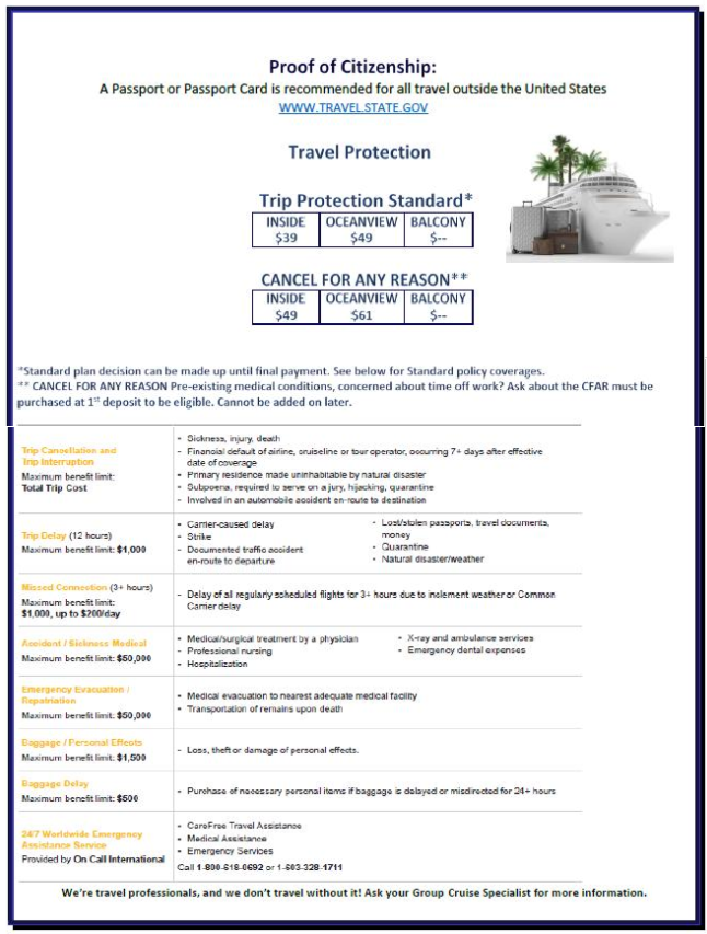 Cruiseline cũng có chương trình bảo hiểm cho khách hàng nào cần. Xin vui lòng xem phần sau: | |