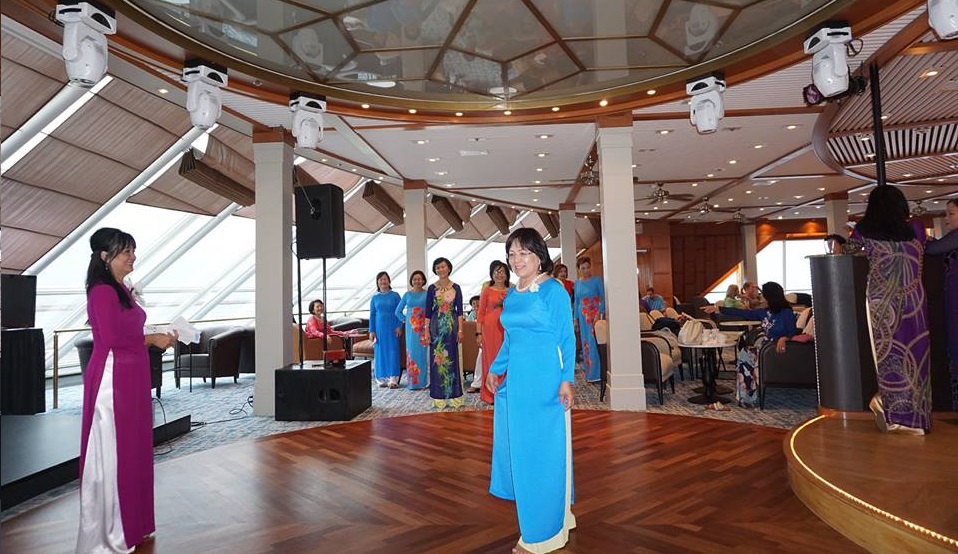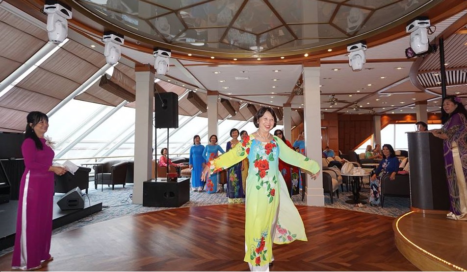 cánh, Ba thương con vì con giống mẹ...Cả nhóm cười ngất ngây. Những du khách ngoại quốc ngồi đó cũng vui vẻ thưởng thức, chắc trong lòng họ cũng tự hỏi, không biết Cruise line này mướn đoàn hát xứ nào lạ quá. |