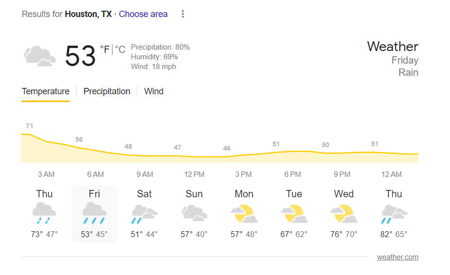 Khí Hâu tai HOUSTON, TEXAS Những ngày sắp tới thành phố Houston và phụ cận sẽ xuống thấp dưới 60 độ F ban ngày và ban đêm dưới 50 độ F ***Nhớ mang theo áo lạnh hay wind jacket*** |