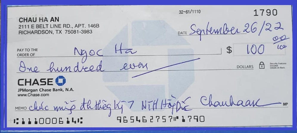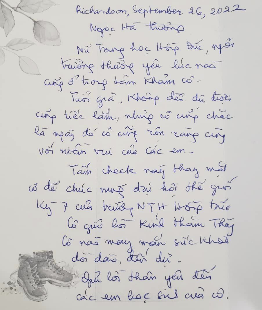 Ban tổ Chức Hội Ngộ 7 vô cùng cảm động và xin hân hạnh chia xẻ đến các chị cùng các bạn lá thư cô An Hà Châu đã gửi chúc mừng Hội Ngộ 7. Vì lý do sức khỏe, cô không đến tham dự ngày Hội ngộ nhưng cũng đã ân cần gửi tấm ngân phiếu đến ủng hộ, | |