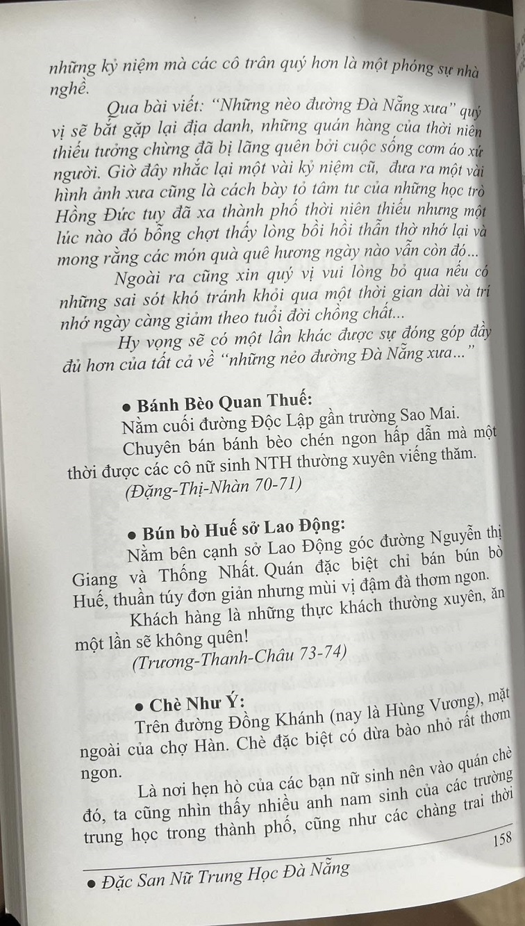 là món quà tinh thần lớn lao cho nhóm điều hành. Bên cạnh những bài đã gửi về, hoặc sẽ đóng góp của những cây viết Hồng Đức thường xuyên tham gia. Phần lớn các chị ngại ngùng, không biết bắt đầu từ đâu, khi cầm viết lên thì ý tưởng bay đi... dù là tình cảm về trường xưa, thầy bạn đầy ắp trong ký ức. Chúng tôi xin trích đăng một hợp bút gồm nhiều cựu nữ sinh trong Đặc San số 3 "VỀ BÊN NHAU" Phát hành năm 2014 tại Virginia trong ngày Đại hội lần thứ 3 Một phần đặc sắc gồm nhiều đoản văn khá thú vị, linh động về đề tài "Những nẽo đường Đà Nẵng Xưa...", đã nhắc lại về những quán hàng thân quen một thời! |