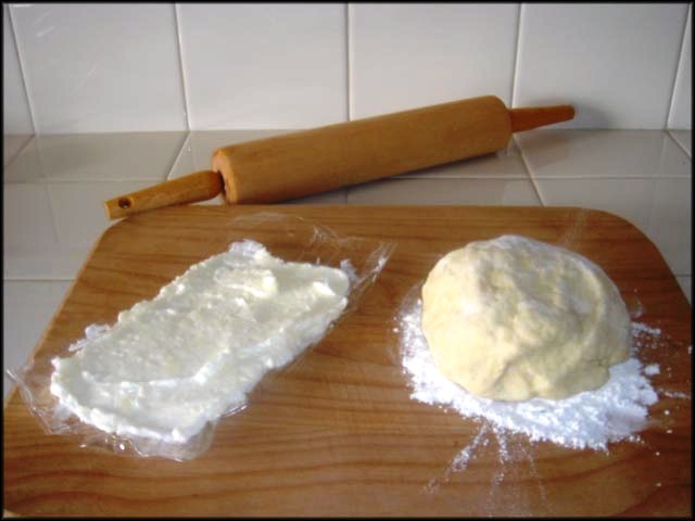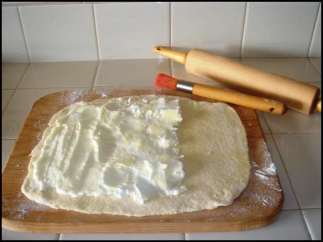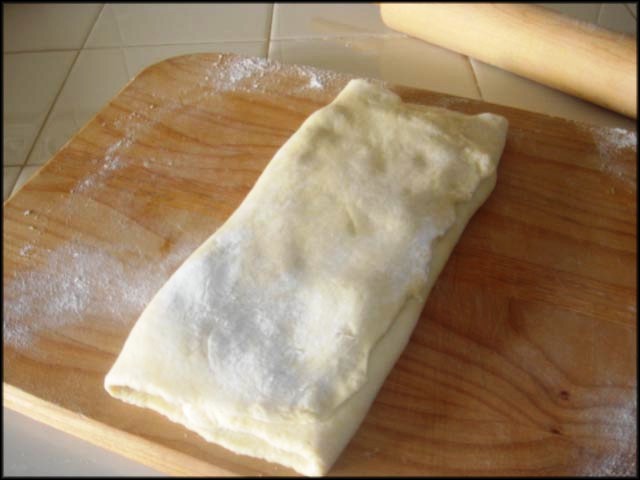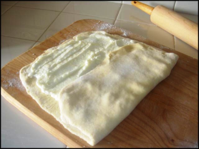 Trong khi đó trộn 1oz bơ và shortening lại đều và là thành miếng như trong hình. Bột đã nghỉ 15 phút, đem cán ra thành hình chữ nhật. Để khối bơ và shortening lên 2/3 bột như trong hình, cán bột ra hình chữ nhật trở lại và xếp làm ba, để bột vào tủ lạnh (để bơ và shortening không bị chảy mềm và dễ cán) chừng 10 đến 15 phút tùy khí hậu bên ngoài. Sau đó mang bột ra cán lại và xếp làm 3 như lần trước, lập lại ít nhất là 3 lần. Phương pháp này làm cho bột vỏ bánh (puff dough) có nhiều lớp sau khi nướng. Bột đã chuẩn bị giữ trong tủ lạnh ( có thể giữ trong tủ lạnh 1,2 ngày, để lâu hơn cất ngăn đông đá) đến khi cần. |