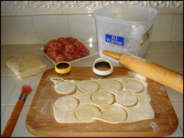 LÀM THÀNH BÁNH VÀ NƯỚNG BÁNH: Bột đã chuẩn bị sẵn và giữ trong tủ lạnh. Khi sẵn sàng đem bột ra, cắt bột làm 3 phần để dễ làm. Cất 2 phần bột chưa làm vào tủ lạnh và gói bằng plastic wrap. Để miếng bột lên mặt phẳng, cho bột áo lên mặt phẳng và cây cán. Cán bột ra, bề dày khoảng ¼ đến 1/5 inch. Dùng khuôn cắt thành từng hình tròn. Những miếng bột rẻo còn lại, các bạn có thể vo lại từng viên, cán trở ra và cắt từng khoanh dùng làm miếng bột ở dưới của những bánh kế tiếp. |