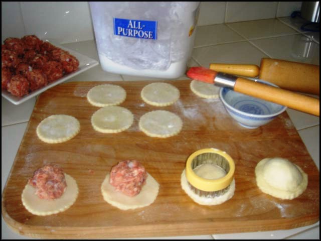 NHÂN BÁNH: Thịt heo xay cho vào tô lớn trộn vào hành củ đã băm nhuyễn, gia vị cho vừa miệng sau đó cho paté gan vào trộn đều. Ngày xưa ở Việt Nam, chúng ta thường cho gan heo xắt hạt lựu vào nhân, ngày nay để tiện lợi và vẫn giữ được hương vị thuần túy, chúng tôi đề nghị dùng paté gan hộp, gia vị trong gan hộp sẽ cho chúng ta hương vị đậm đà rất ngon. Vo viên nhân lớn nhỏ tùy vỏ bánh. Trong bài này chúng tôi xài khuôn cắt 2 inches, hơi nhỏ hơn vỏ bánh bánh sẵn, và viên nhân sẽ là 1 inche tròn. |