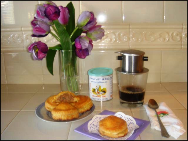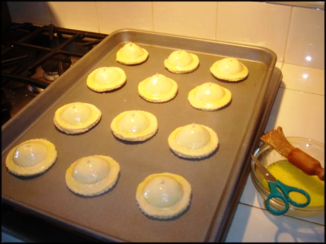 Lấy nhân để lên một mếng bột tròn, thoa nước chung quanh nhân và lấy miếng bột khác để lên trên, lấy ngón tay ấn nhẹ cho 2 miếng bột dính lại với nhau. Lấy khuôn nhỏ hơn ịn lên trên mặt bánh tạo thành 1 vòng tròn làm viền bánh. Dùng cọ bôi dầu thoa mặt bánh lên trên. Vặn lò 375 độ F, nướng chừng 15 phút, bớt lửa xuống 350 độ nướng thêm chừng 15 nữa thì bánh chín. Nếu làm bánh lớn hơn thì nướng bánh thêm chừng 5 hay 10 phút. Hy vọng các bạn sẽ vừa ý với những chiếc bánh ngon xốp vừa ý. |