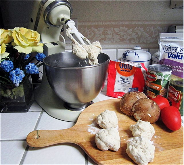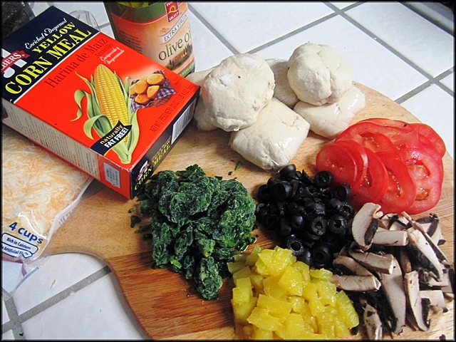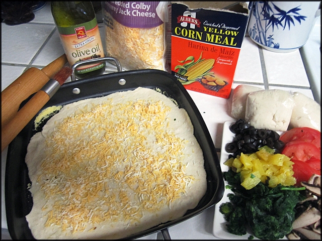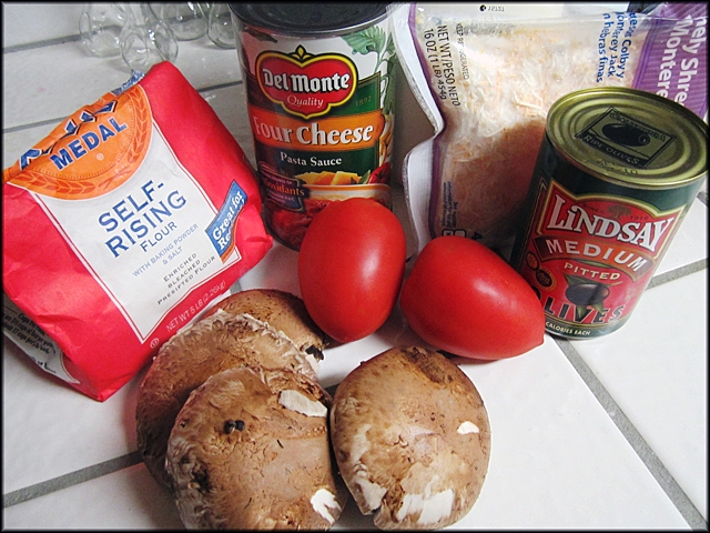 - 4 1/2cup bột mì self-rising (đã có bột nổi sẵn) - 1 3/4 cup nước đá lạnh - 1/4 cup dầu olive + 1/4 cup để nhúng bột sau khi mix - 1 tí muối - Bột bắp xay (cornmill) - fromage: chọn loại ưa thích từ 1 đến 2 cup tùy theo khẩu vị - Cà chua, nấm, olive, thơm (*)