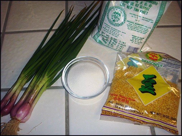 - 1 gói bột nếp 16 oz. - 1 cup nước uống - 1 gói đậu xanh 12 oz. - 1 bó hành - 1/4 cup đường - 1 muối - Dầu ăn