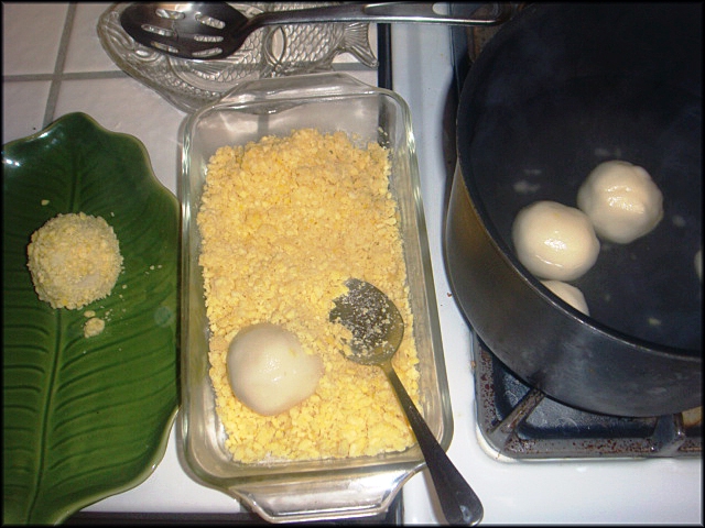 Sau đó lấy miếng bột bằng viên nhân đâu xanh đã chuẩn bị trên đây, bọc bột chung quanh nhân vo viên tròn và đem luộc trong nồi nước đang sôi. Khi bánh nổi lên là được. |