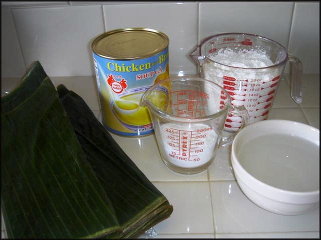 1/ 2 cup bột mì tinh - 3 cup nước súp gà - 3 cup nước - 2 muỗng canh dầu ăn để trộn bột - 2 muỗng canh dầu ăn để xào nhân - Gia vị: muối, tiêu, đường, nước mắm, bột ngọt. - 1 xấp lá chuối |