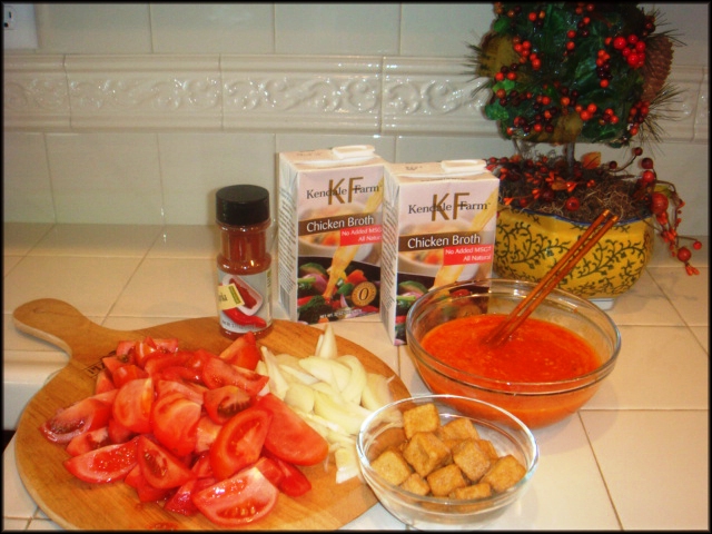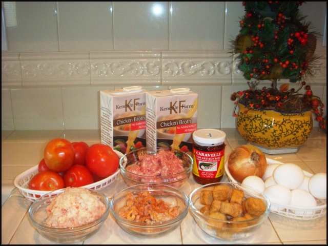- 1 lọ riêu cua 7 oz. - 1/2 pound thịt xay - 6 đến 7 cái trứng gà - 1 chén nhỏ thịt cua - 1 chén nhỏ tôm khô - 6, 7 trái cà chua - Nước súp - Đậu hủ chiên