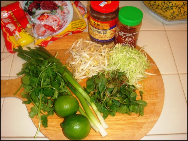 Dọn tô bún với dĩa rau và chanh ớt, mắm tôm.