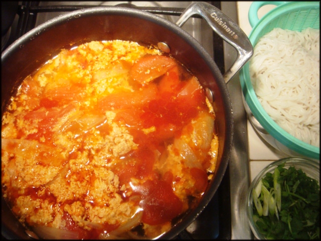Cho nước súp vào nồi nấu cho sôi lên và để lửa riu riu. Hành và cà xắt như để xào.