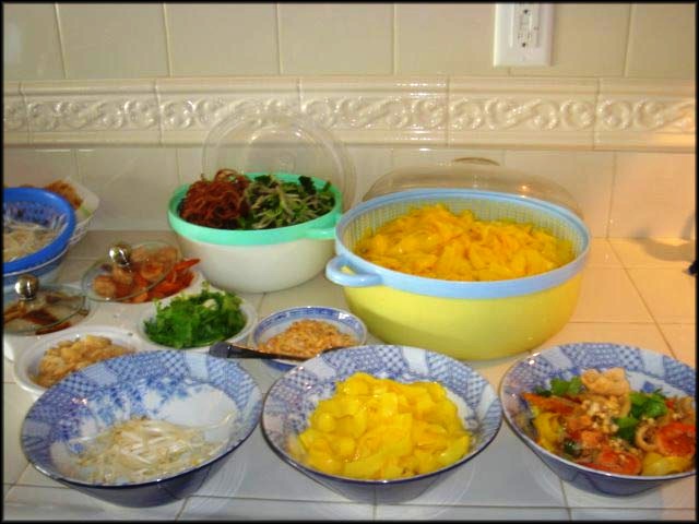 a) Chuẩn bị mì: Bánh phở khô để làm mì cho vào thau lớn ngâm với nước và màu vàng chừng vài tiếng đồng hồ cho thật mềm, sau đó đem đổ ra rổ. Nấu nước sôi trụng mì cho chín đổ ra rổ xả nước lạnh cho sợi mì rời ra. Sau đó cho 1 ít dầu ăn vào trộn đều để sợi mì không dính lại với nhau. Để mì (đã chuẩn bị) qua một bên. b) Nấu nước lèo và chuẩn bị nhân: Tôm đem cắt khúc đầu để nấu nước cho ngọt và có màu đẹp. Mình tôm lột vỏ lấy gân trên lưng xong rửa sạch và ướp với gia vị cho thấm. Thịt heo, cắt miếng như xào ướp với bột nghệ, gia vị. Lấy một nồi đặt lên bếp lửa lớn, nồi nóng cho dầu và hành củ cắt miếng vào xào cho thơm, sau đó cho thịt heo đã ướp vào xào lên cho đều, kế đến là đầu tôm. |