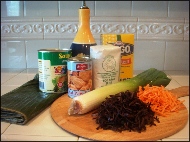 - 2 cup bột corn starch - 1/ 2 cup bột mì tinh - 3 cup nước súp chay - 3 cup nước lạnh - 2 muỗng canh dầu ăn - 1 xấp lá chuối
