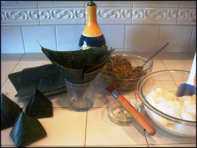Lá chuối rửa và lau sạch. Dùng kéo rọc miếng lá vuông vắn, xếp lại làm 4 và mở ra như trong hình, có thể dùng một ly cạn, để lá vào cho dễ gói.