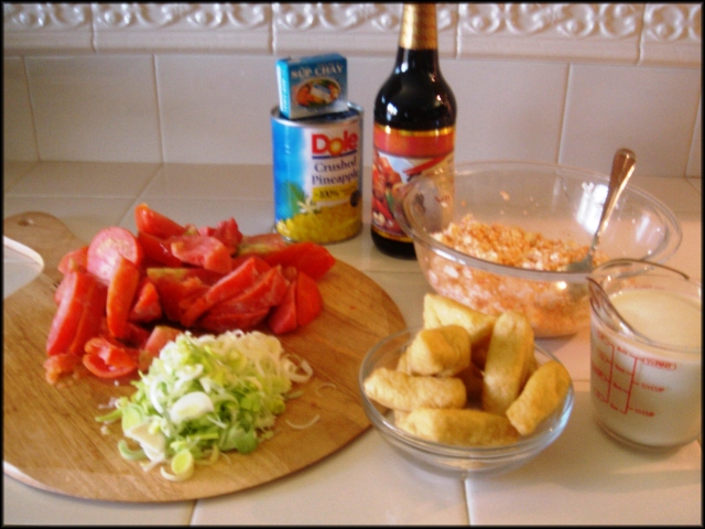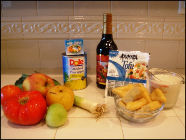 - 1 hộp đậu hũ loại mềm - 2 cup tàu hũ chiên sẵn (hay 1 hộp tàu hũ cứng thái (xắt) miếng vuông chiên) - 1 cup sữa đậu nành - 1 lon nước súp rau quả (vegetable broth) hoặc 4 viên súp chay - Vài trái cà chua - 1 cup thơm bằm (tươi hay hộp cũng được) - 1 trái táo, 1 trái lê (*) - 1 nhánh poireau - Ngò - Gia vị, màu hạt điều, ớt bột, dầu ăn
