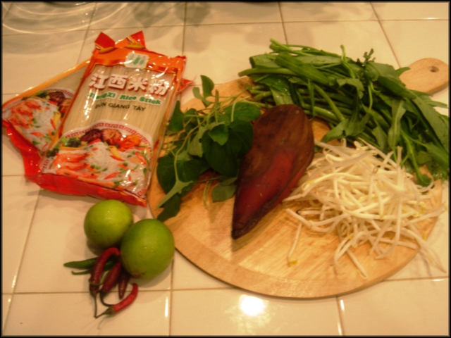 - 1 gói bún - Rau sống: Tía tô, kinh giới… - Giá - Bắp chuối, rau muống (nếu có, có thể thay thế bằng bắp cải thái (xắt) mỏng) - Chanh, ớt