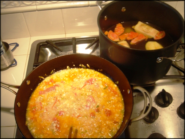 Trong khi đó chuẩn bị riêu chay như sau: Tàu hũ non tán nhuyễn trong tô lớn, cho gia vị màu điều vào ướp cho thấm. Cà xắt miếng. Poireau xắt phần trắng để xào.Dùng một chảo lớn, cho dầu vào xào với phần trắng của poireau cho thơm xong cho tàu hũ đã ướp trên đây + cà chua + thơm bằm (chừa lại một ít nước để làm nước “mắm” chan), xào tất cả lên lên cho đều, sau đó cho cup sữa đậu nành vào, để lửa vừa cho tất cả sôi lên, nêm nếm cho vừa ăn. |
