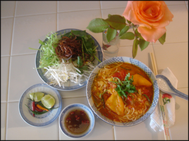 CHUẨN BỊ VẬT LIỆU ĂN KÈM: Bún luộc chín để ráo. Phần xanh của poireau thái nhuyễn (như hành lá), ngò rửa sạch cắt khúc. Rau sống, rửa sạch để ráo. Nếu có bắp chuối, rau muống thì càng tốt, chuẩn bị sẵn một ít. Chanh ớt cắt miếng cho vào dĩa nhỏ. Cũng chuẩn bị một chén nước “mắm” chay gồm nước thơm, xì dầu và tí xíu đường. |