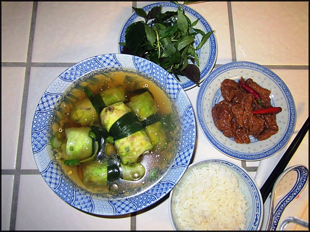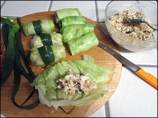 Lá bắp cải đã trụng mềm để lên một mặt phẳng, múc tàu hủ đã chuẩn bị trên đây lên lá bắp cải, nhẹ tay gói laị như gói chả giò. Dùng lá poireau đã xé nhỏ sợi để cột cuốn bắp cải.