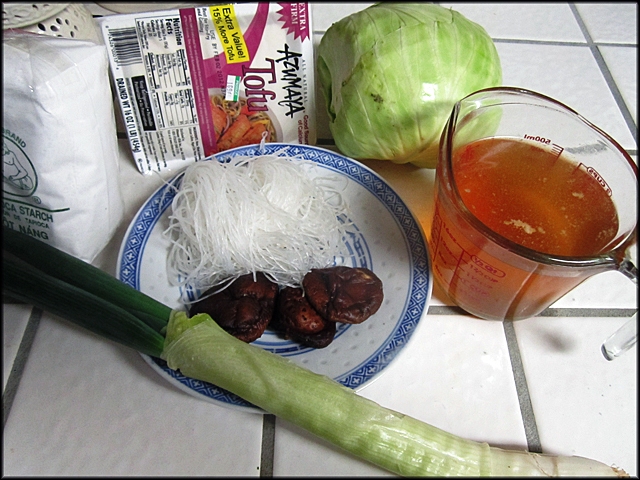 - 10 đến 12 lá bắp cải lớn - 2 miếng tàu hủ loại cứng - Poireau - Nấm đông cô (nấm hương) - Bún tàu - Chừng 3 muỗng súp bột năng - 2 cup nước soup chay - Dầu ăn để xào - Muối, đường, xì dầu, bột ngọt