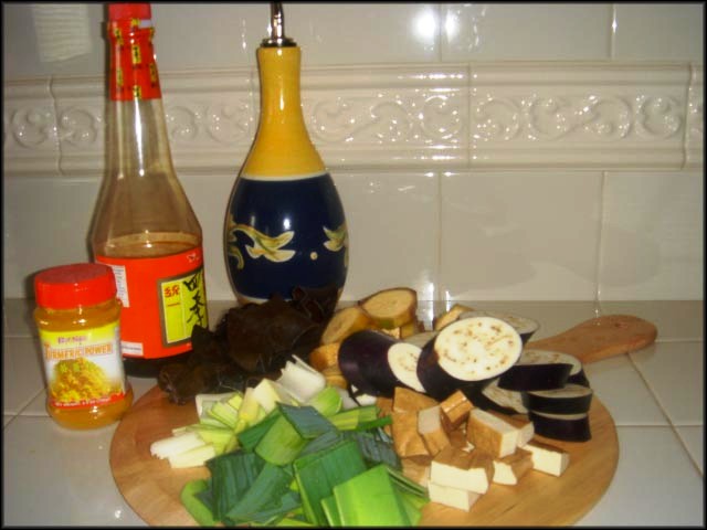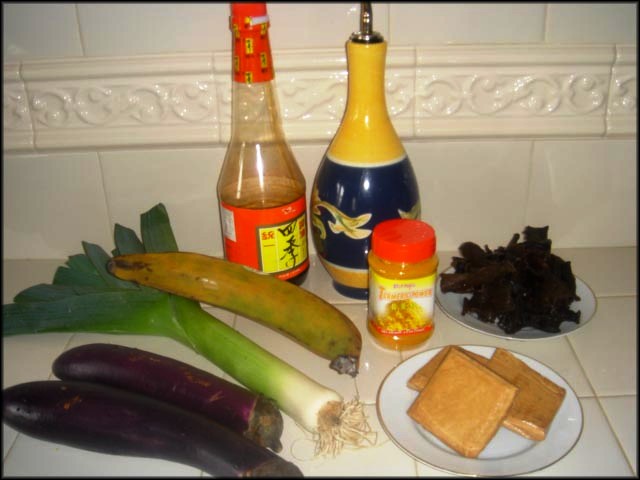 - 1 trái chuối chát lớn (ở Mỹ thường có chuối này trong chợ, nhập vào từ Nam Mỹ, gọi là plantains. Nếu mua được chuối chát của người Việt thì xài chừng 2-3 trái) - 2 trái cà tím - Đậu hũ chiên - 1 nhánh poireau - 1 chén nấm mèo - 1 muỗng cà phê bột nghệ - 1 viên nấu súp chay (hay 1 lon súp rau cải, vegetable broth) - Xì dầu, dầu ăn, muối đường |