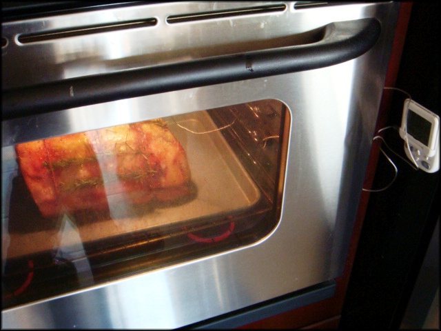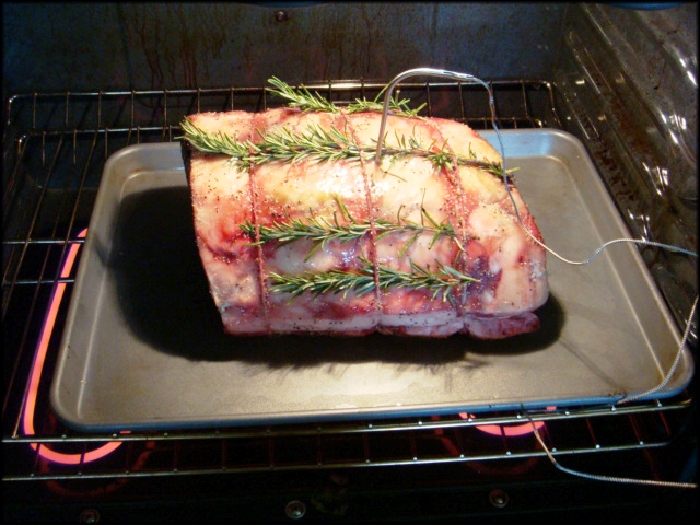 Đem khay thịt để vào tủ lạnh (không đậy lại) khoãng chừng 3, 4 ngày. Lớp mỡ trên mặt sẽ khô lai và phần đỏ ở hai đầu thịt sẽ xậm lại chứ không tái. Sau đó đem miếng thịt ra, gia vị để ướp cho chung vào một tô trộn đều, dùng tay chà gia vị lên miếng thịt cho đều (*). Để vài cọng rosemary lên trên cho thơm. Vặn lò 300 độ F (**), dùng nhiệt kế đo nhiệt độ (***) ghim sâu vào giữa miếng thịt, để nhiệt độ của thermometer từ 120 nếu thích ăn hơi tái (như trong hình), đến 130 - 135 nếu muốn chín hơn. Nếu không có nhiệt kế để đo nhiệt độ, nướng từ 3 tiếng 15 phút đến 3 tiếng rưỡi cho miếng thịt với cân lượng trên đây. Thịt nướng xong đem ra khỏi lò dùng giấy bạc đậy miếng thịt lại để giữ thịt nóng, không nên rút thermometer ra liền, nước ngọt sẽ chảy ra và thịt khô mất ngon. |