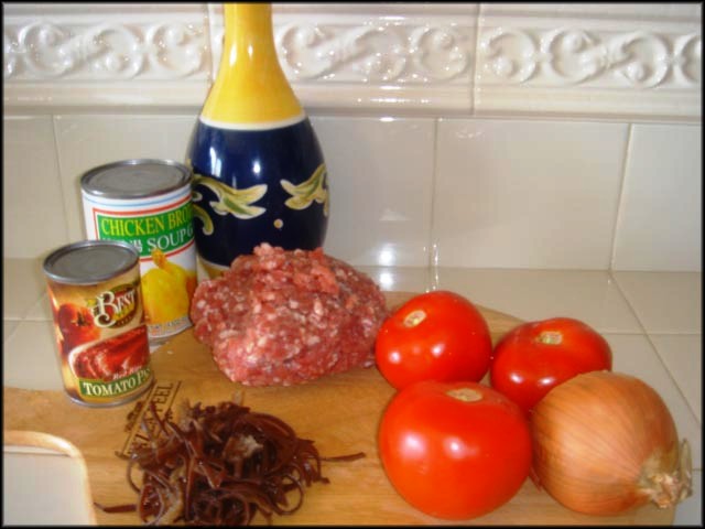 1 củ hành tây lớn - 1 lon súp gà - 1 lon tomato paste 6 oz. - 1 ít nấm mèo nếu thích - 1 ít nấm rơm nếu thích - Dầu olive - Tỏi, muối tiêu, đường - 1 đến 2 muỗng canh bột mì
