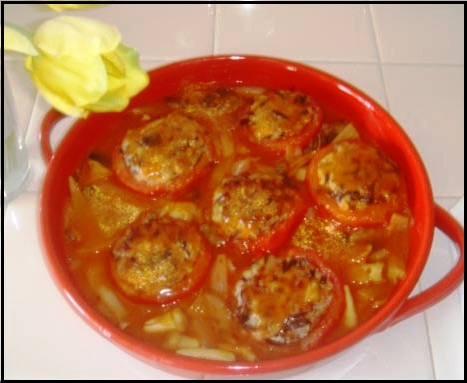 Cách làm: Cà chua rửa sạch, cắt ngang làm đôi, dùng muỗng múc trong ruột cho sạch và hết hột, dùng giấy chùi tay lau cà cho ráo nước và để qua một bên. Hành củ xắt miếng lớn như để xào. Thịt heo cho vào tô, cho nấm mèo và gia vị vào trộn đều ( có thể cho thêm hành bằm nhuyễn họac đậu petit pois nếu thích). Dùng một muỗng múc thịt đã ướp cho vào cà đã chuẩn bị trên đây. Cho thịt vừa đầy miếng cà thôi để mau chín. Bắc chảo lên bếp lửa vừa cho dầu olive vào, để miếng cà đã nhồi thịt vào, mặt có thịt heo xuống chiên trước, chừng 5 phút thì trở mặt dưới lên chiên chừng 2 phút. |