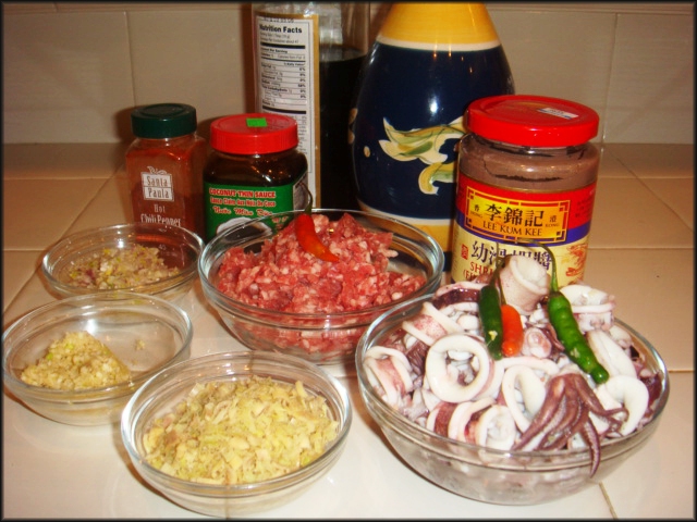 - 1 pound mực ống (dùng loại mực nhỏ thì xào sẽ mềm và ngon hơn) - 1/2 pound thịt heo xay - Vài tép xả - 1 muỗng canh mắm ruốc - 1 chút nước mắm - 1 muỗng cà phê đuờng - Hành hương, tỏi, tiêu, ớt bột, dầu ăn, bột ngọt - Ớt trái |