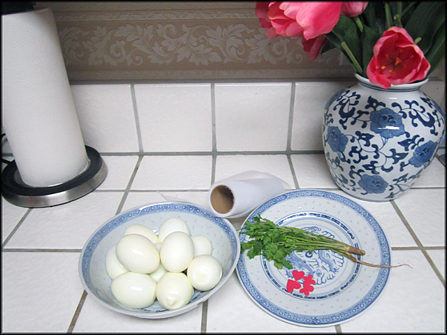 Lấy trứng đã chuẩn bị trên đây, đặt lá ngò lên, hoặc hình đã cắt sẵn lên.