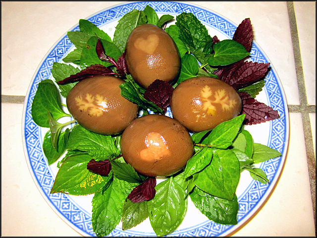 Khi trứng chín, vớt ra và tháo bỏ phần vải lưới. Trứng sẽ có hình trái tim, hoa hay lá ngò màu trắng rất đẹp mắt.