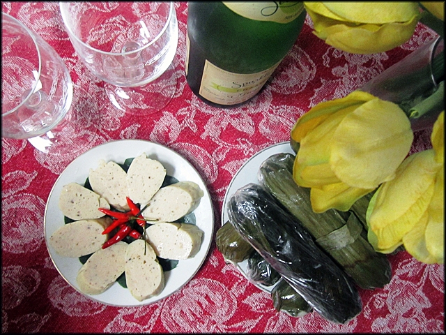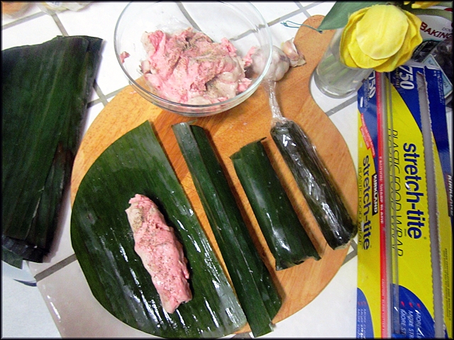 Cân 6 oz. một phần, gói đòn chả nhỏ và dài như trong hình. Lót lá chuối bên trong và giấy bóng bên ngoài cuộn lại chặt cho chả mịm đẹp.