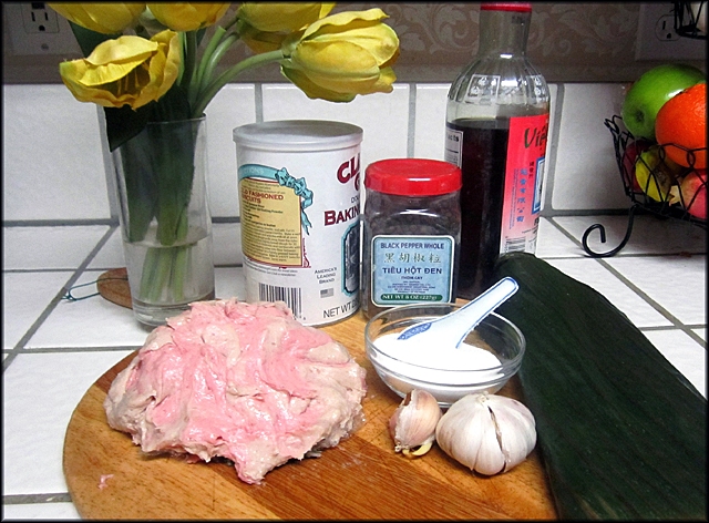 - 3 lbs 1/2 thịt heo nạt xay - 2 muỗng cà phê bột nổi baking powder - 6 muỗng canh nước mắm - 6 muỗng canh đường - 4 muỗng cà phê tiêu xay to - 2 muỗng canh bột mì tinh - 3 muỗng cà phê bột khoai tây - 1/4 cup nước lạnh - Tỏi bầm nhuyễn - Lá Chuối