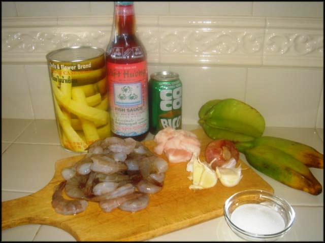 - 1 pound tôm bạc cỡ 26-30 - 4 oz. thịt mỡ - 1 muỗng cà phê nước mắm - 1 muỗng cà phê muối - 3 muỗng cà phê đường - Tiêu - 1 lòng trắng trứng - Tỏi, hành hương - 1 lon coconut soda (có thể thay bằng 1 lon diet seven up) - Mía để ghim chạo tôm.