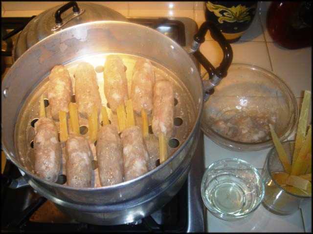 Mỡ cho vào máy xay, bấm cho máy chạy nhanh, tắt máy, cho máy chạy lại và tắt máy, làm như vậy 4, 5 lần (phương pháp này gọi là PAUSE, giống như bằm nát thịt chứ không phải xay nhuyễn). Cho mỡ đã bằm trên đây vào tô tôm cùng với lòng trắng trứng trộn đều tay. Đem tô tôm để tủ lạnh chừng 1 tiếng. Mía chẻ khúc vừa, chạo tôm đã lạnh đem bắt lên mía và hấp chừng 5 đến 7 phút. Chạo chín đem bỏ vào hộp, khi gần ăn đem nướng lò than họặc oven 350 độ chừng 15 phút. Khi chạo tôm vàng đều là được. |