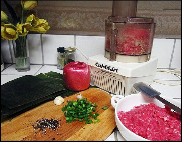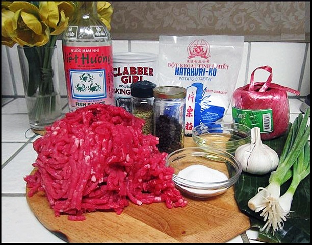 Trong một tô lớn cho tất cả vật liệu vào (trừ hành tỏi), quậy lên cho đều. Thịt bò xay mua về đem trộn đều với tô gia vị đã chuẩn bị trên đây, dùng muỗng trộn cho thịt đều với tất cả, sau đó đem tô thịt cho vào ngăn đá chừng nửa tiếng đồng hồ.