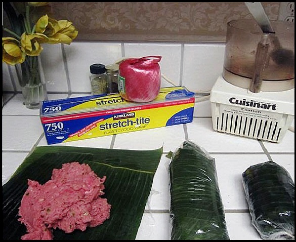 Lá chuối lau sạch, phết chút dầu ăn lên mặt xong cho giò đã xay lên, gói lại và cho vào xửng hấp chừng 45 phút là giò chín.